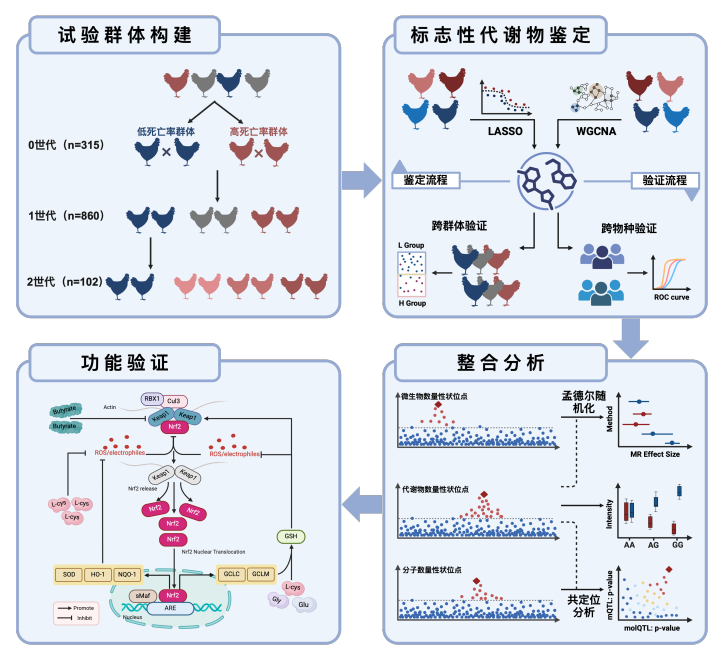 记者从中国农业科学院获悉,中国农业科学院北京畜牧兽医研究所鸡遗传育种创新团队近日通过整合多组学数据,系统筛选了白羽肉鸡与死亡风险相关的标志性代谢物,阐明了遗传变异导致白羽肉鸡代谢紊乱进而引发死亡的作用机制。 据介绍,白羽肉鸡是我国主要畜禽品种之一,也是动物源食品生产的重要支撑。经过长期的遗传选育,白羽肉鸡生长速度和生产性能显著提升。但在白羽肉鸡机体动态代谢过程中,代谢物变化与抗病力高低之间的关系尚不明晰,抗病性状的遗传基础仍未系统解析。